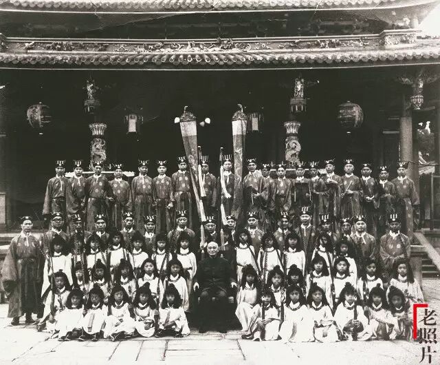 为了消除日本殖民的影响,蒋介石在台湾大力倡导“中华文化复兴运动”。图为晚年的蒋介石与在祭孔大典上表演八佾舞的小朋友们合影。(原载《老照片》第51辑)