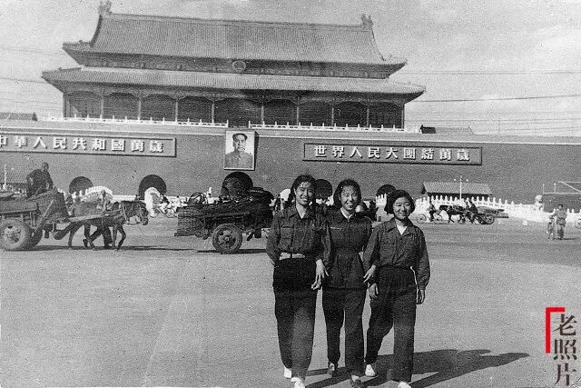 20世纪50年代初,天安门广场地面干净平整,三位工人模样的姑娘欢笑地走来,背后的长安大街上马车和自行车在来往穿梭。(原载《老照片》第54辑)