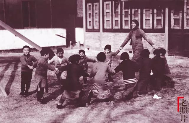 1935年12月30日,南京金陵女子文理学院的一位年轻的幼教老师带着孩子们在草坪上做游戏。(原载《老照片》第6辑)