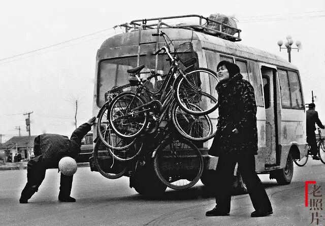 1989年,一辆个体公共汽车在马路上随停随走。车厢后边挂满了乘客的自行车,司机躬下身子观察车辆底盘,旁边的售票员趁此间隙扯着嗓子喊有没有上车的顾客。(原载《老照片》第98辑)