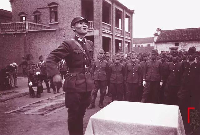 1945年9月,中国第三方面军高级参谋曹大中视察芜湖日军集中地,向放下武器的日军官兵训话。(原载《老照片》第11辑)