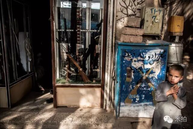 六七岁的孩子站在枪店门口。