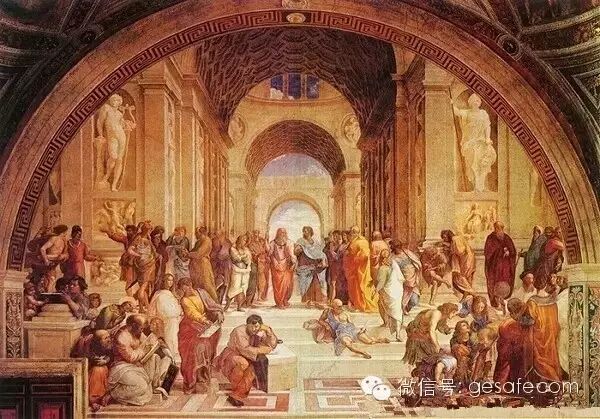 7、拉斐尔--雅典学院,全画以纵深展开的高大建筑拱门为背景,大厅上汇集着不同时代,不同地域和不同学派的著名学者。作者希望以回忆历史上黄金时代的形式,寄托他对美好未来的向往。