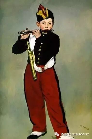 马奈是最早打破传统的棕褐色调,使画面明亮、有外光新鲜感的画家。这幅画在总的暗调子中,突出几块明亮鲜艳的色彩,使之更加响亮耀眼。