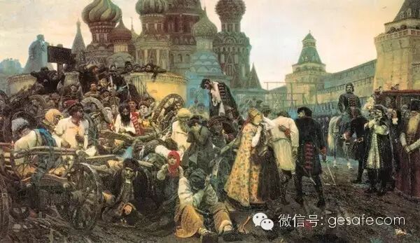 近卫军临刑的早晨,该画以彼得大帝1698年镇压近卫军兵变这一历史事件为背景而创作的。画家选取了兵变失败的近卫军在莫斯科红场临刑前的悲壮时刻。