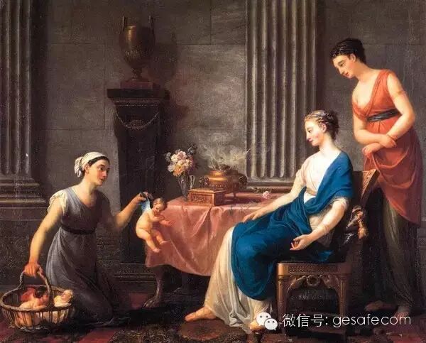 画中女主人被刻划得高贵而矜持,女商人则从提篮里抓出一个带翅膀的小男孩(无疑这是小天使),构成一个充满戏剧性的场面。如果说画家描绘的是当时社会现实的话,那么那个正在被贩卖的长着翅膀的孩子,无疑又给作品增添了扑朔迷离的色彩。