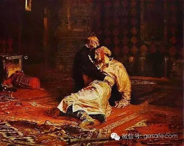 伊凡雷帝在一次与他儿子争执时,用笏杖猛掷过去,不幸击中儿子头部。这一偶然的暴烈冲动致使儿子送命,伊凡顿悟这绝后的可怕举动,立刻上前搂抱垂死的儿子,睁大恐怖、悔恨交加的双眼。他想求儿子饶恕,兽性和人性同时显在他身上。为了增强画面的恐怖感,画家有意采用了深重的红色调。该画集中刻画伊凡的瘦脸,瞪着两只大眼珠,那种不可逆转的杀子之痛预示着伊凡统治将临灭亡。