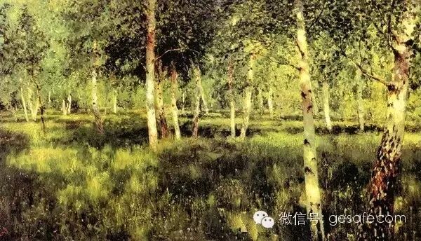 53、列维坦--白桦丛,作者尝试描绘阳光照在桦树林中的光感和空气感,具有鲜明的印象派画风。