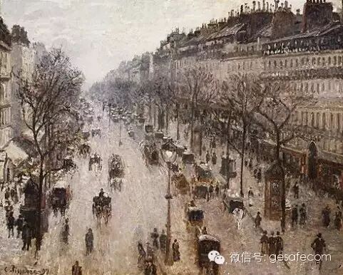 26、毕沙罗——蒙马特大街冬天的早晨,画于1897年,整幅画视角宽广、构图宏伟、透视准确。画中车马人流很小,粗笔带来,却仿佛在画中移动、生动形象。