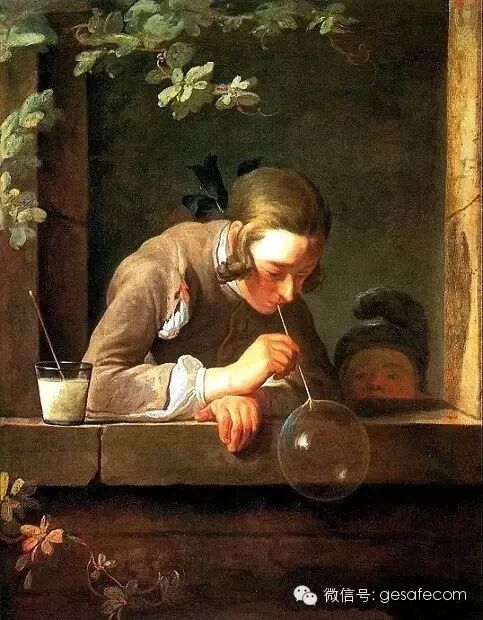 一个衣着破旧但不失整洁的少年正从室内向室外吹着肥皂泡,他聚精会神小心翼翼地将肥皂泡越吹越大,越吹越大。还有一个孩子,看上去仅有3、4岁,正踮着脚扒着窗台使劲从室内向室外观看……题材非常普通,情境极为单纯,这是一种清闲、安逸的生活情趣,反映了下层平民的孩子们自然、俭朴的快乐生活。