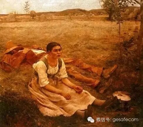 那因“垛草”而劳累过度躺在草地上酣睡的农夫,他好像刚刚吃过妻子送来的饭,用草帽盖着脸正在享受着这片刻的轻松;年轻体壮的少妇默默的坐在丈夫的身边,长期生活的艰难使她显得疲惫不堪,神色已变得象老年人一样呆滞而默然……