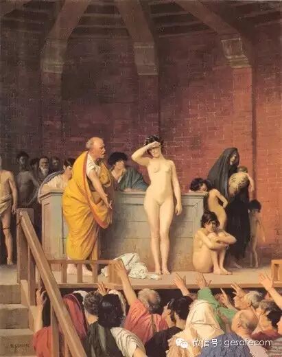 近东地区司空见惯的奴隶拍卖,引起了画家的注意。被剥去衣衫的女奴,裸体站在台上被拍卖,台下是争相竞价的商人,他们伸出手指,暗喻买奴隶的价格,女奴们茫然地望着这一切,听凭命运的摆布……