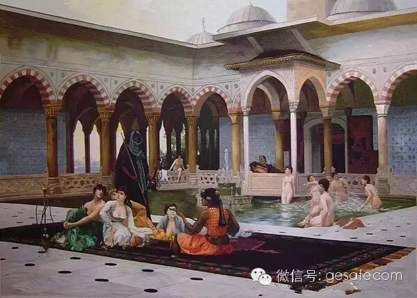 该画描绘了阿拉伯王宫最隐秘的后宫生活,描绘了生活于后宫的王妃、宫女等女眷的闺阁生活,有的在洗浴,有的在清谈,有的在沉思......不过作者想表达的内容不止于此,你能体会得到吗?