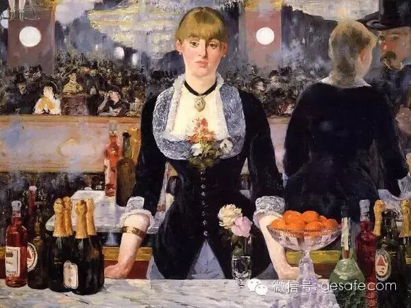 56、马奈晚年的代表作--福利·贝热尔的吧台,创作于1882年,这幅画是作者生前最后一次刻画他所熟悉和喜欢的巴黎喧嚣和豪华的生活。