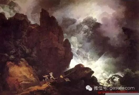 这是一幅以严谨的手法描绘阿尔卑斯山雪崩景象的风景画。画家十分注意造型与色彩的关系,近景的暖色与中、远景的冷灰形成对比,产生了纵深的空间感,块状的山岩造型及不同斜线的构图,造成了雪崩的动感与恐怖气氛。画家以写实的手法,再现了雪崩的奇异与壮观景象,形象地表现了山崩地裂、气势逼人的自然威力。