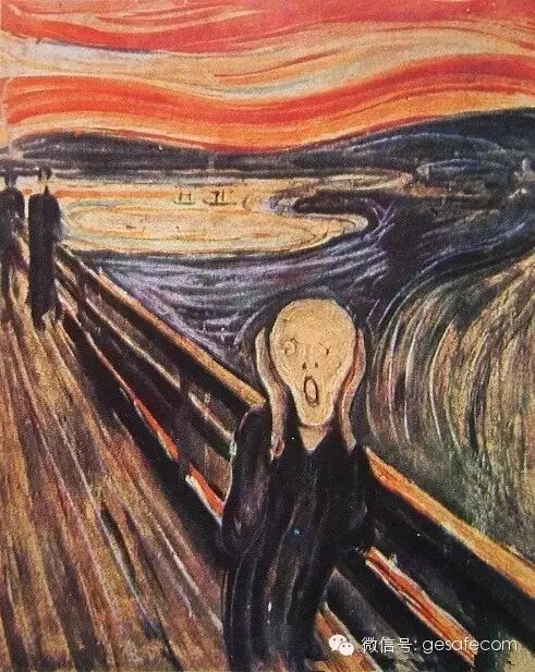 非常有名的一幅画,它描绘了一个面容近似骷髅的人,双手捂住耳朵,站在一条看不见首尾的公路桥上,似乎由于惊吓而大声呐喊。画家以版画的方式,把红、蓝、绿、赭石的色线,组成流动的河水与天空的形状,造成—种游动与飘忽的动态,给人以不安感,似乎是一场“恶梦”的再现。它象征着“世纪末”人们的彷徨情绪。