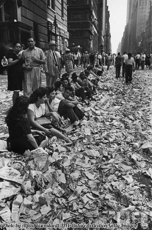24.1945年,纽约市,人们坐在路边的纸条和纸屑中庆祝二战结束。