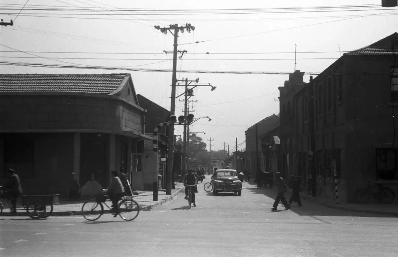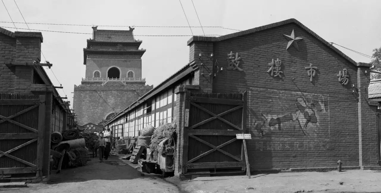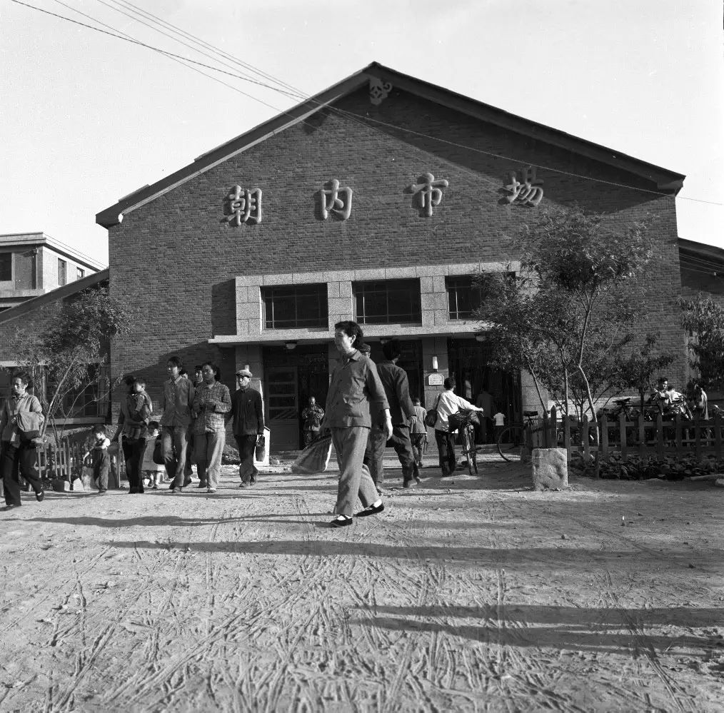 上世纪60年代的朝内市场外,地面似乎还是土路,自行车轮压过的痕迹清晰可见;如今朝内市场外已是柏油路,时代的变迁尽在其中。