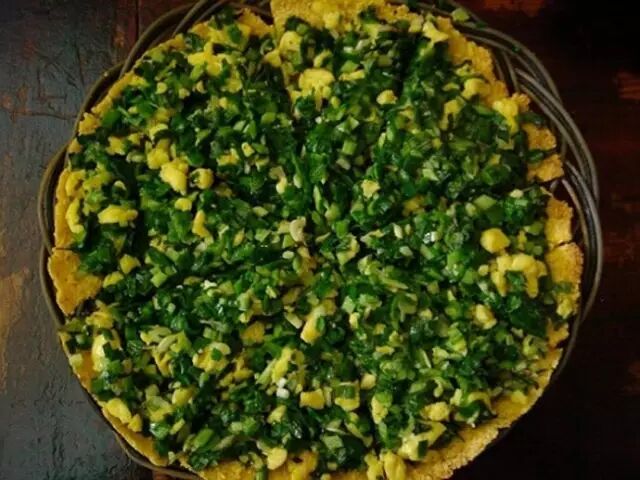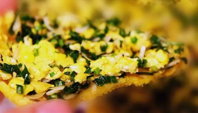 翠绿的韭菜、金黄的炒鸡蛋、白色的虾皮拌在一起,盖在和好的玉米面薄饼上,烙到饼底金黄焦脆,一定要馅儿多到看不见饼底才最好吃!!!