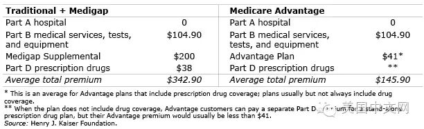 Part C 医疗进阶计划:因为前两部分光负担80%的费用,剩下的20%需要再买一个补充保险(Medigap),又要额外加购Part D,月付额实在太高,Part C就提供了另一个费用低廉的选择。Part C 内合格的医疗计划一定包含Part A和Part B的福利,有些可能还包含Part D。