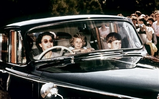 英国女王伊莉莎白二世驾车载着查尔斯王子和安妮公主,1957年