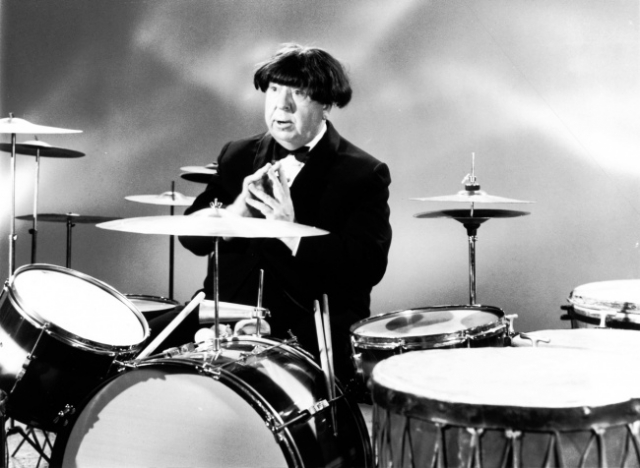 希区柯克带着假发模仿披头士乐队成员,1964年