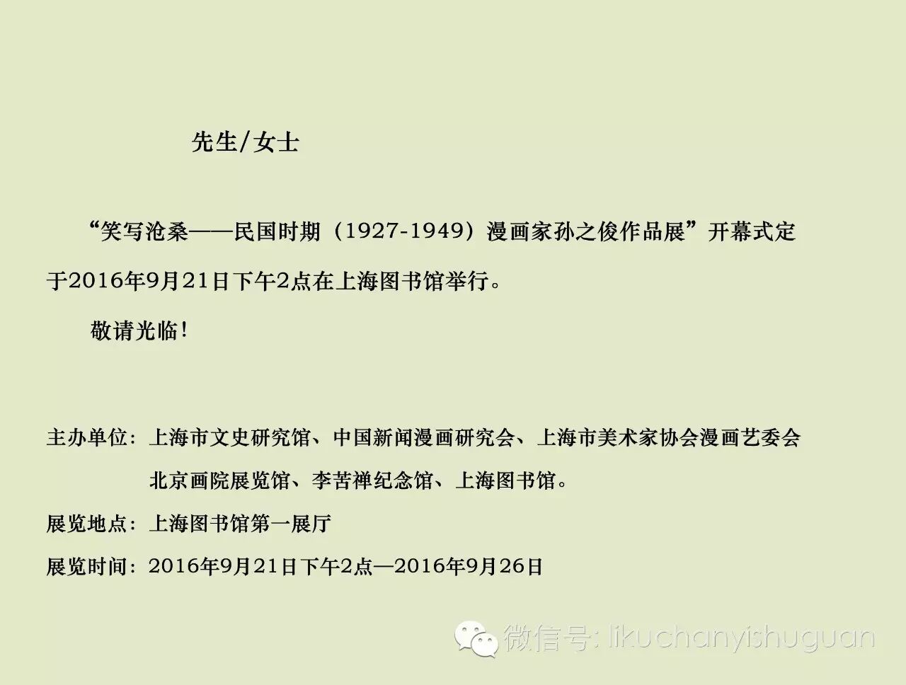 由上海市文史研究馆、中国新闻漫画研究会、上海市美术家协会漫画艺委会、北京画院美术馆、李苦禅纪念馆、上海图书馆主办的“笑写沧桑——民国时期漫画家孙之俊作品展” 将于2016年9月21日下午2点在上海图书馆开幕。 这是继2016年4月在北京画院展出后的第二次展览。今年恰逢孙之俊诞辰110周年、逝世50周年,特举办本次展览,回顾孙之俊先生的漫画创作历程与他为中国漫画发展所做的贡献。展览共展出漫画作品及相关图稿共近百余件。为观众了解民国时期的中国漫画创作发展提供了一次宝贵的机会。