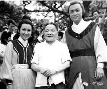 鲍起静、邓、方平。邓老爷子在散步偶遇他们在拍戏的,拍戏的就要求和邓老爷子合影,就有了这张照片。