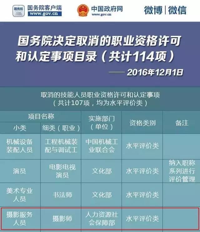 经李克强总理签批,国务院日前印发了《关于取消一批职业资格许可和认定事项的决定》,再次公布取消114项职业资格许可和认定事项,涉及技能人员职业资格有107项,均为水平评价类,其中就有摄影师资格证。