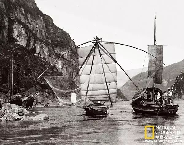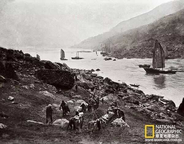 1920年,长江上游,纤夫们用一条竹索把帆船拖过凶险的激流。
