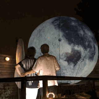 在北京中秋节,一位老爷爷自己买了一个巨大的气球月亮,想给老伴一个惊喜。