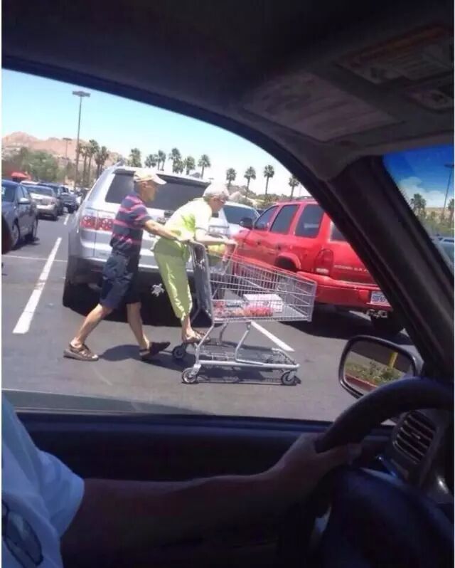 超市门口的停车场,一位老奶奶蹲在地上,对着自己老伴说:“累了,走不动了”。老爷爷哈哈大笑,对奶奶说:“没事儿,我来推你”。
