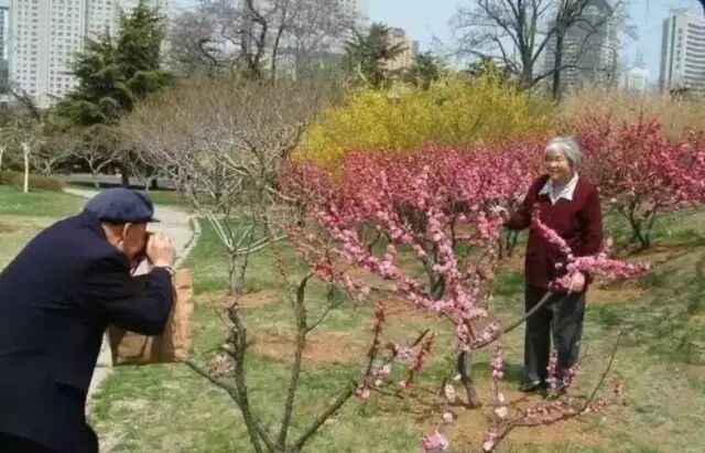 在公园散步时,偶遇一位老爷爷,正在指挥老伴摆姿势,嘴上说着:“对对,就站那别动,你和花站在一起特别美”。