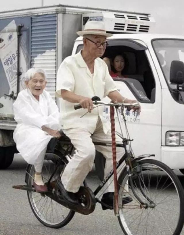 在韩国,路人拍下一对老夫妻,老爷爷推着自行车,老奶奶叉腿坐在后座,推着推着老爷爷突然骑上车就跑。