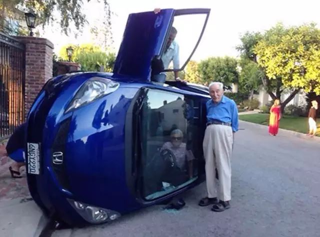 美国有一对夫妻,开车回家时刚起步,老奶奶一不小心将车开上消防栓,导致翻车,确定双方都没事后,老爷爷出来第一件事,就是和车里的老伴合影。