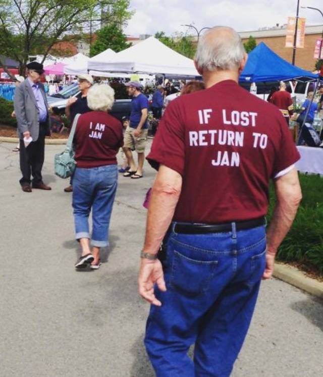 老爷爷后背写的是:“如果我走丢了,请把我还给Jan”,而老奶奶后背写着“我就是Jan”。
