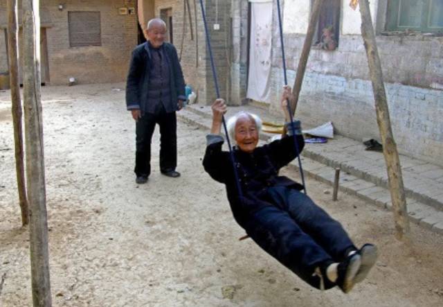 在山西,一位老爷爷正在院子里,推着自己的老伴荡秋千,空荡的院子很安静,没有人打扰他俩。