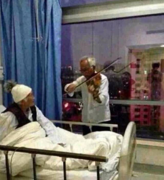 在昆明一家医院里,一位老奶奶患病住院,因为怕她孤单,年过七旬的丈夫每天从家赶来照顾她,每当到了下午6点,老爷爷都会为老伴拉小提琴,帮她解闷。
