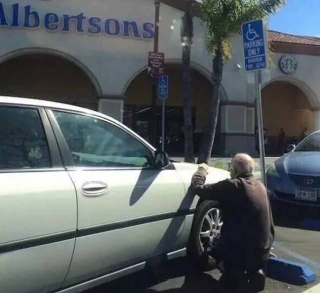 在路边,一位年迈的老人蹲在一辆车旁,车主走过来关心地询问:“您哪里不舒服吗,需不需要帮忙?”