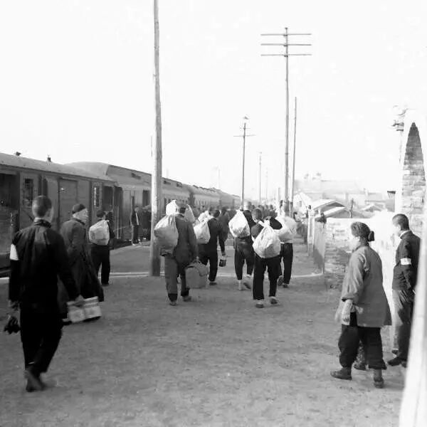 河南新乡或者是焦作火车站,正在上车的旅客。志波杨村/摄,照片大约拍摄于1940年左右。