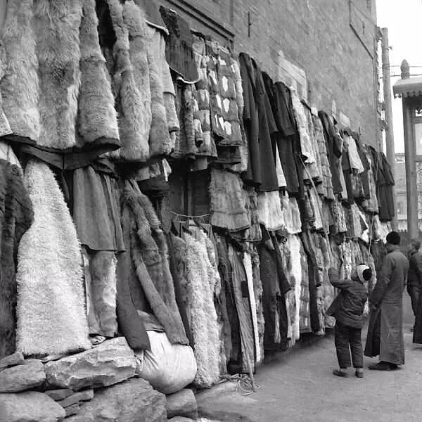 挂在墙外兜售毛皮的商贩。志波杨村/摄,照片大约拍摄于1940年左右。