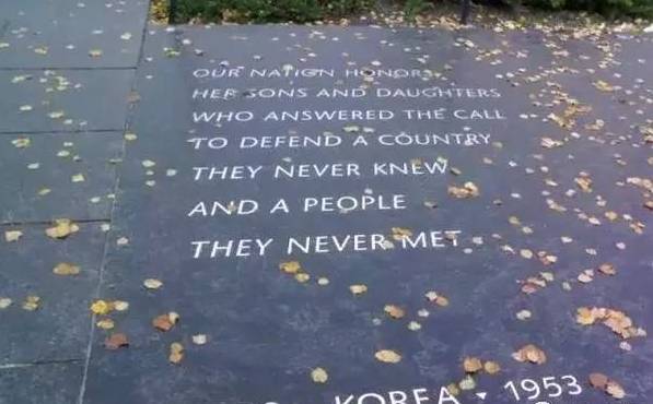 我们停在这只有一句话的碑文前,不由有些发愣,就愣在“保卫”这个词上。美国兵千里迢迢去朝鲜,他们凭什么言称“保卫”,他们又究竟去保卫了什么?这是一场跨越了半个地球的战争。我们也想到,在有着信息自由法的美国,政府不可能对于这样一场战争,向他们的士兵和家属隐瞒重大历史情节。这个朝鲜战争纪念碑是在1995年6月27日才揭幕的,远在1982年揭幕的越战纪念碑之后,那么,在经历了对越战的不断重新认识之后,美国人在建立这个朝鲜战争纪念碑的时候,为什么还能够保持整整半个世纪的自信,坚信这样一个远征是正义的呢?