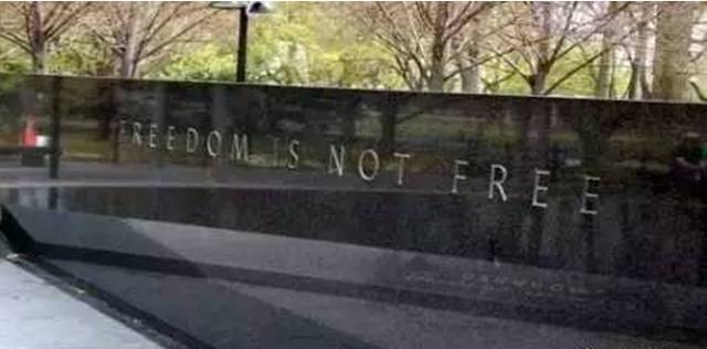 很难在纪念碑上直接找到彻底的答案,因为这个纪念碑园区的文字非常少。除了上面这段碑文,另外,就只有一句话的碑文了,那是用银色的字,镶镌在一座同样简洁的黑色花岗岩纪念碑上的。纪念碑座落在一个圆形的水池中。它是整个朝鲜战争纪念碑的主题:
