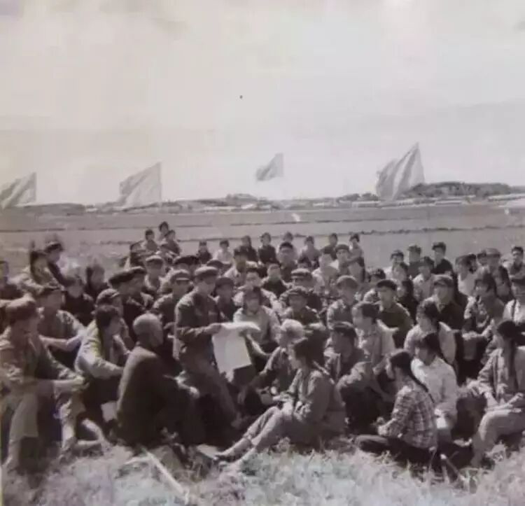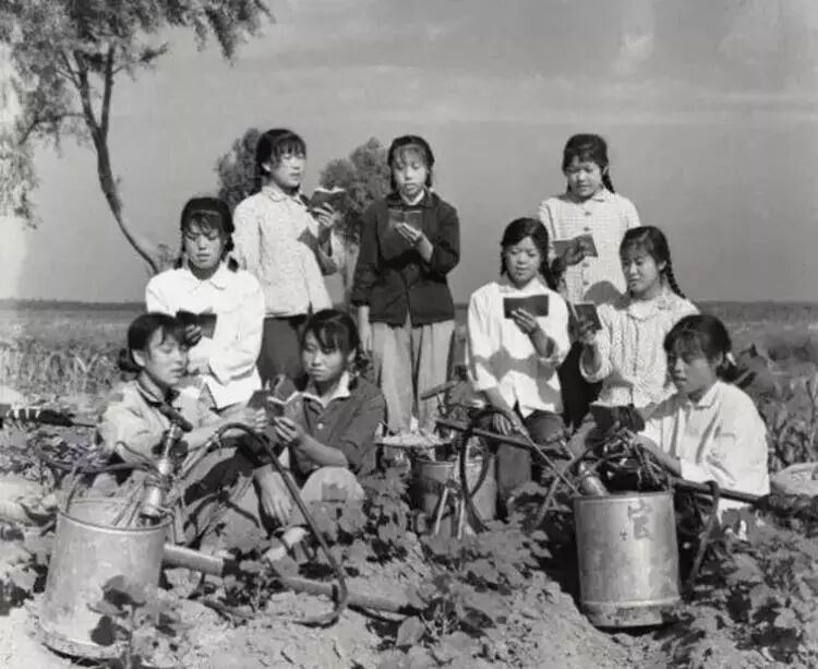 1972年,一群女知青每天劳动之前,在地头学习毛主席语录