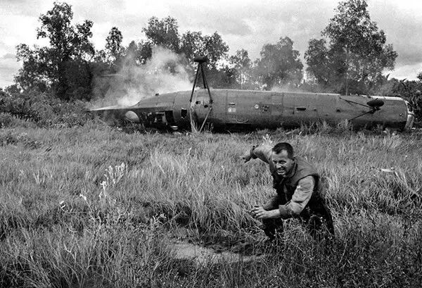 1962年12月11日,一个美国机组成员逃离坠毁在越南南端的直升机。