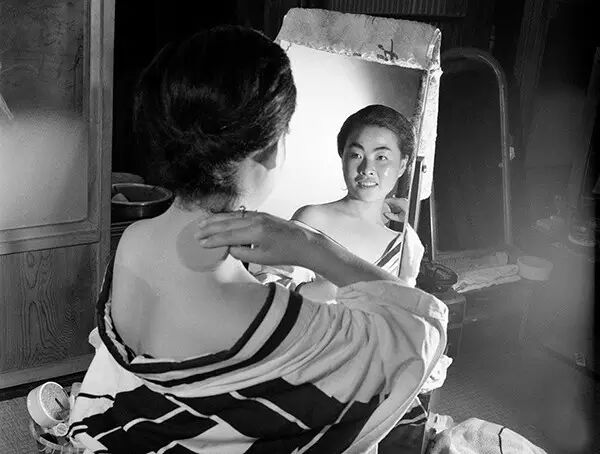 1962年7月19日,日本,艺伎女孩准备晚会上的表演而给自己画白色的妆。