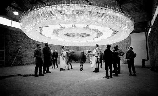 1962年11月29日,西德一个豪华屠宰场,牛被宰杀前,在这个光彩夺目的大吊灯下被赶着走最后一英里进行展示。