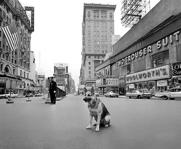 1961年4月28日,美国纽约,一只狗坐在时代广场,此时正在进行10分钟的防空演习。
