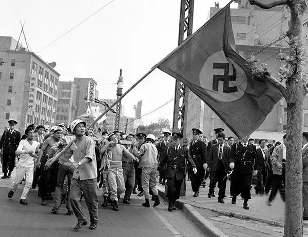1961年5月1日,日本东京,极端民族主义者扛着卐旗在日比谷公园举行集会,呼吁解散社会党。