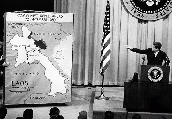 1961年3月,华盛顿的一场记者招待会上,总统肯尼迪指向老挝地图,他指出老挝面临共产主义威胁是一种“潜在危险”。